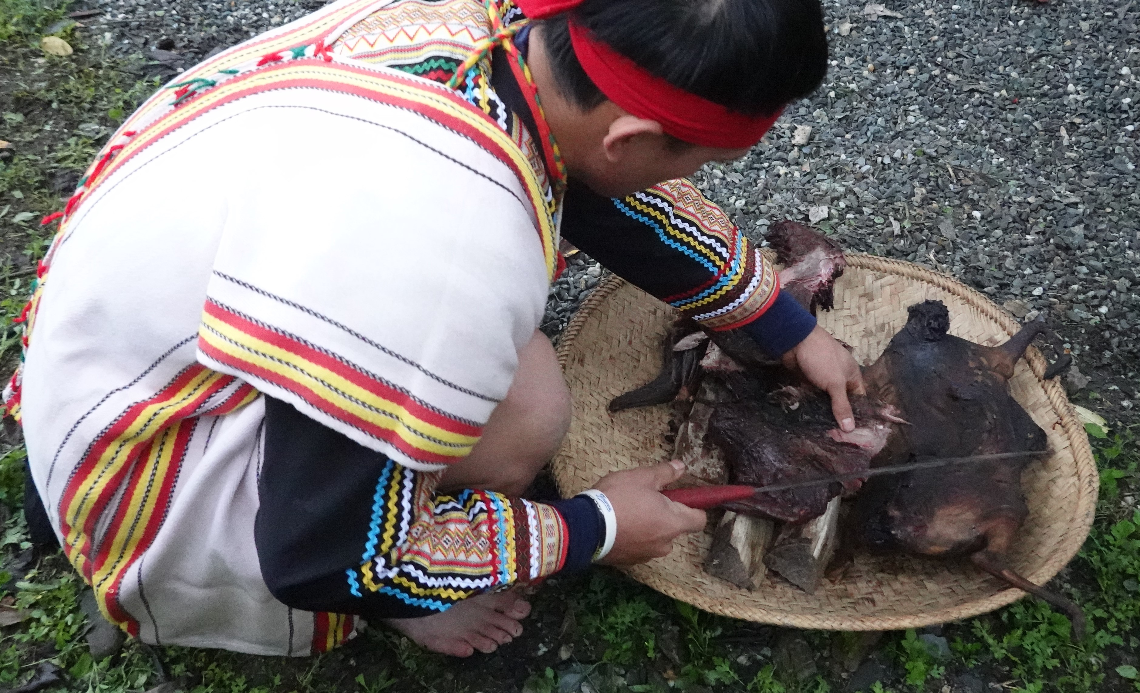 緊接著,進行的是對獵具與獸肉的祈福儀式。狩獵的獵槍與所得獸肉被放置在竹編的篩子中,置於火堆之上接受火與煙的祝福,象徵對獵物生命的感謝,同時祈求未來狩獵順利、族人平安。這些經過祝福的獸肉,隨後會與小米酒一同分享,象徵祝福的食物必須於祭場當下享用。